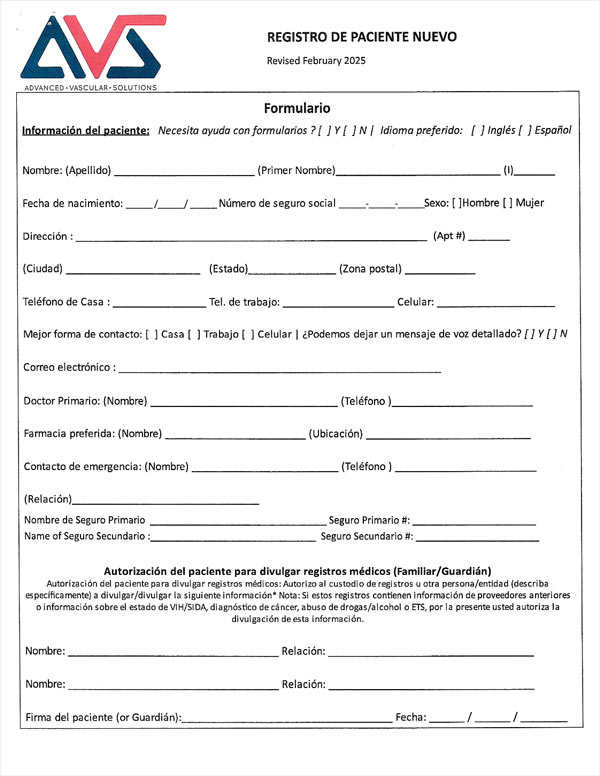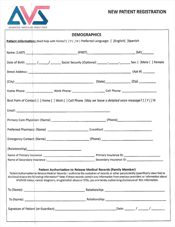 Advanced Vascular Solutions provides our patients with office forms for your convenience. We recommend you print and fill these forms prior to your appointment to save time.